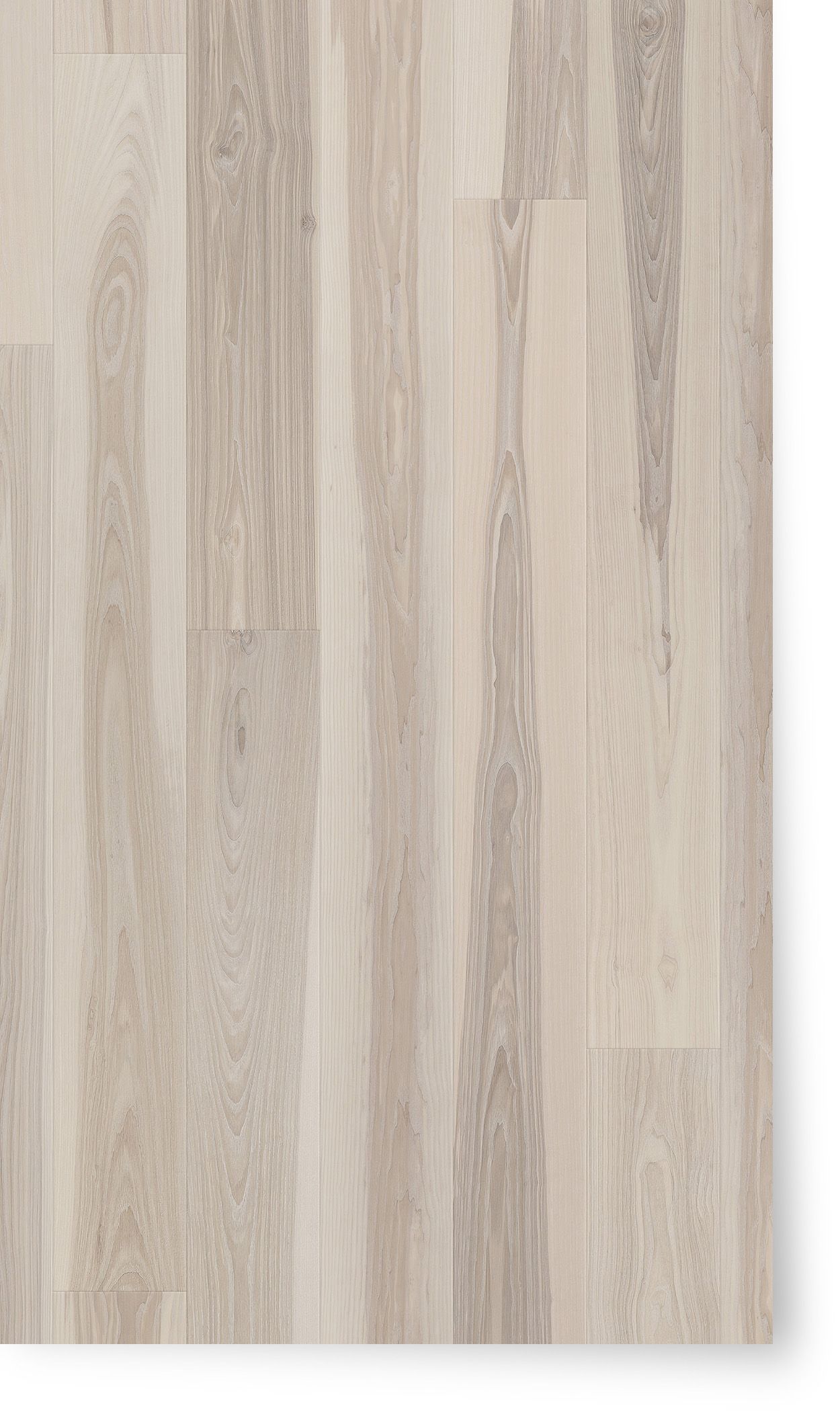 Pre-finished by hand, this remarkable selection of Ash has a playful bright Scandinavian touch. The wood is bleached treated with our lye against yellowing. the surface is treated with hardwax-oil and can be soaped and reoiled time after time to feed and protect the surface patina. This finish works best in randomly blended wider and longer boards for floors or walls.