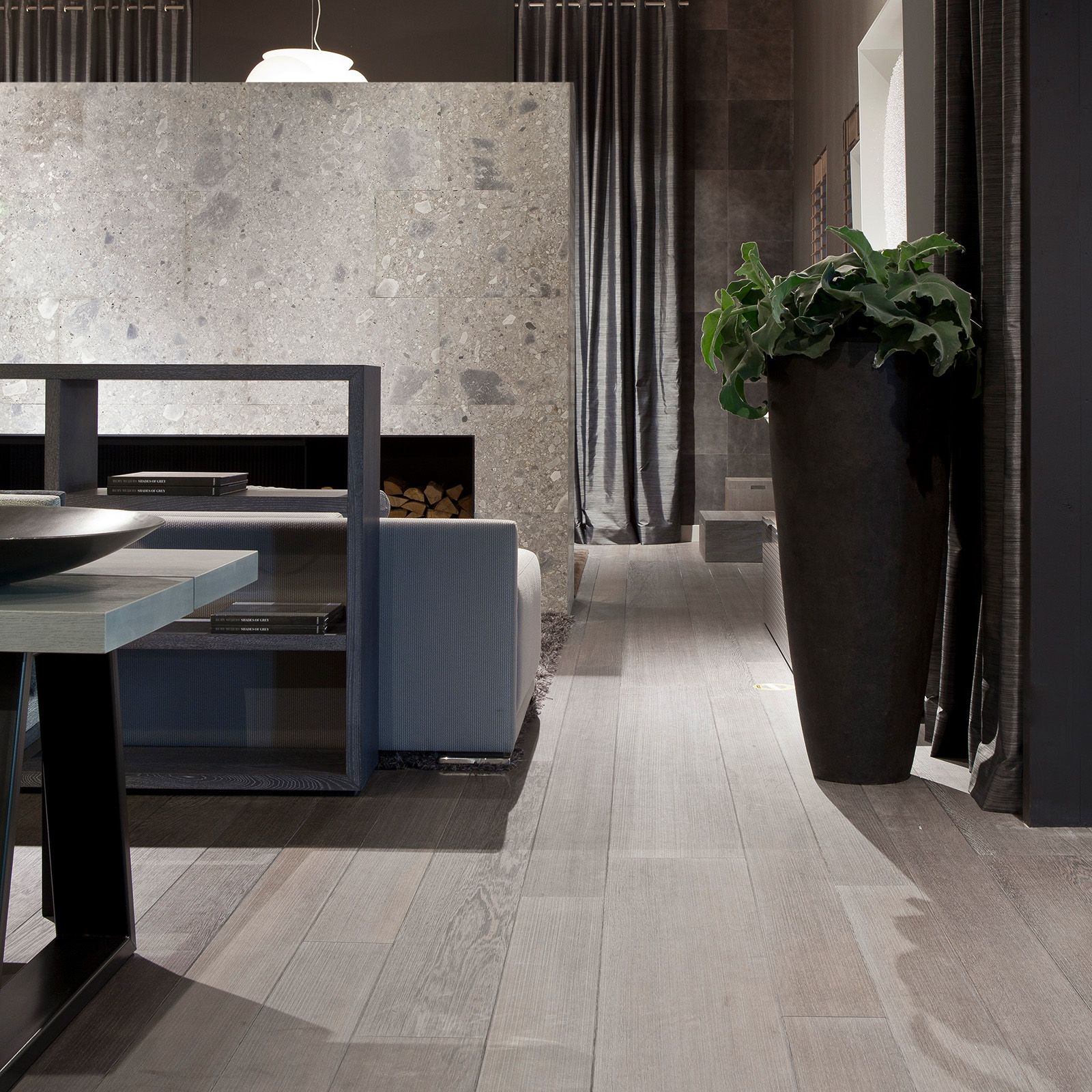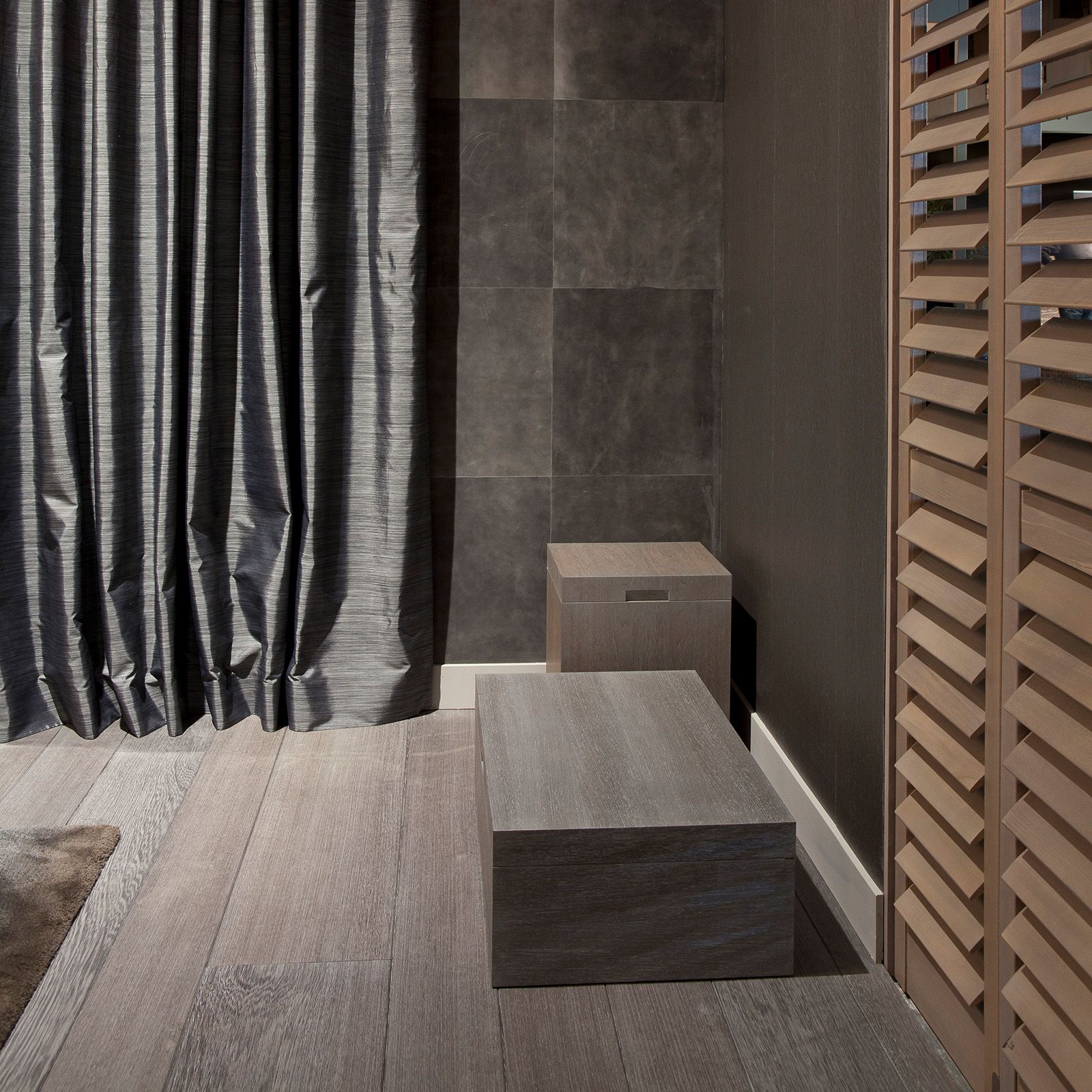 Floor:Wengé, finished with Custom Silvergrey Hardwax, in random widths of 17-30 cm.
