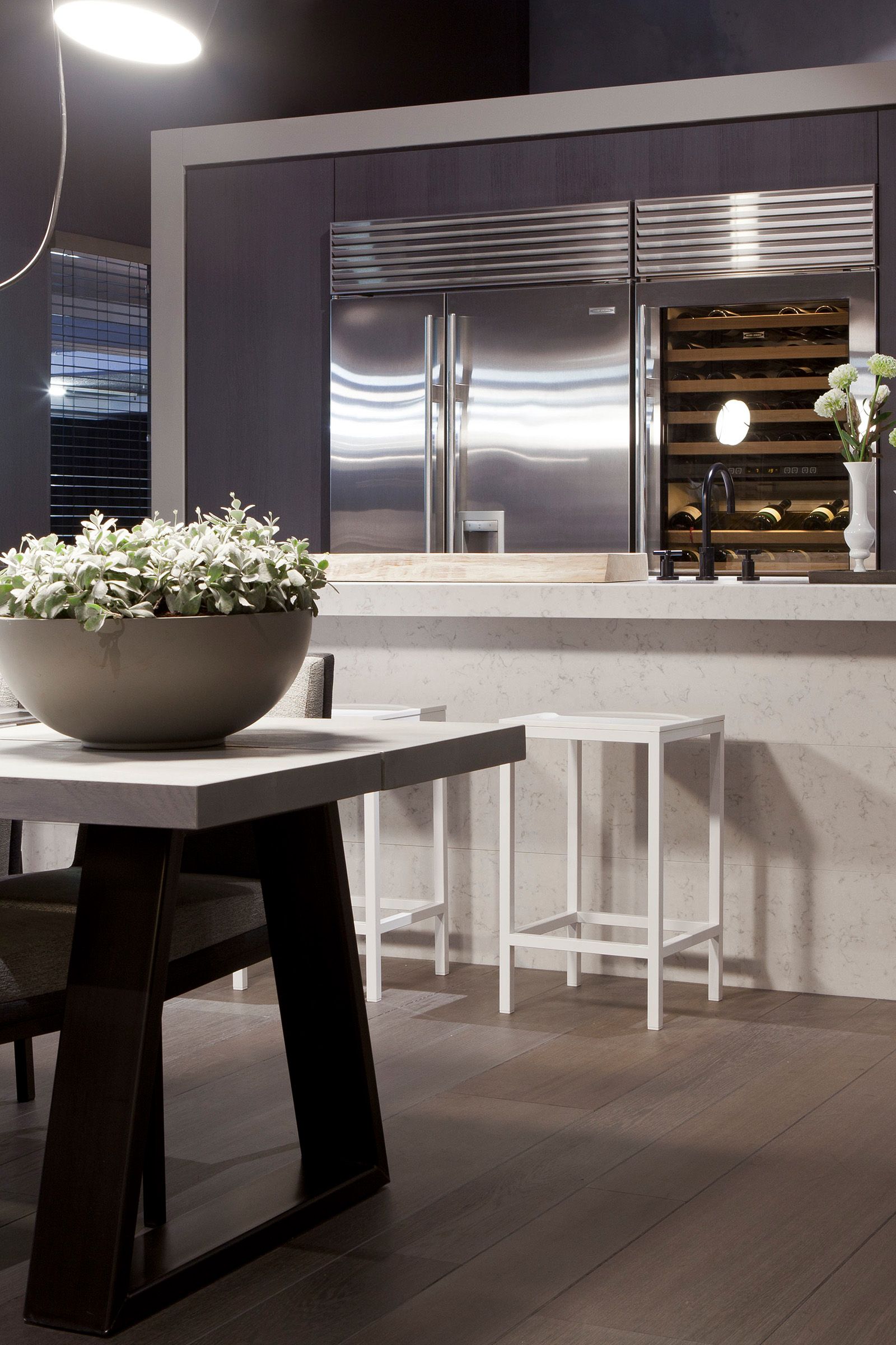 The Wengé flooring complements the muted gray palette, creating a cohesive and serene environment.