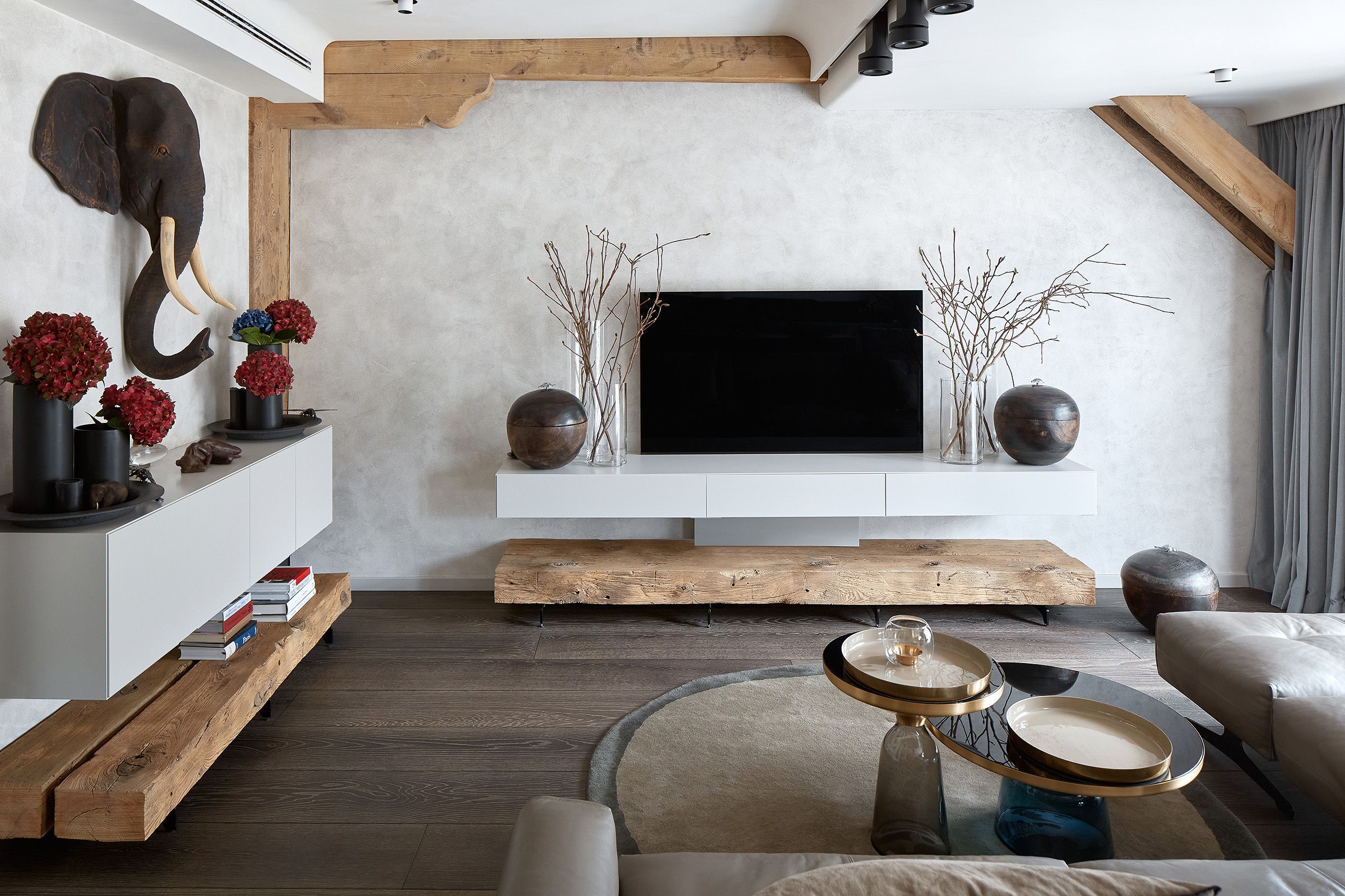 In the living room, the rich tone of the Megeve Lava finish creates a warm backdrop for natural wood, sculptural ceramics, and soft neutral tones.
