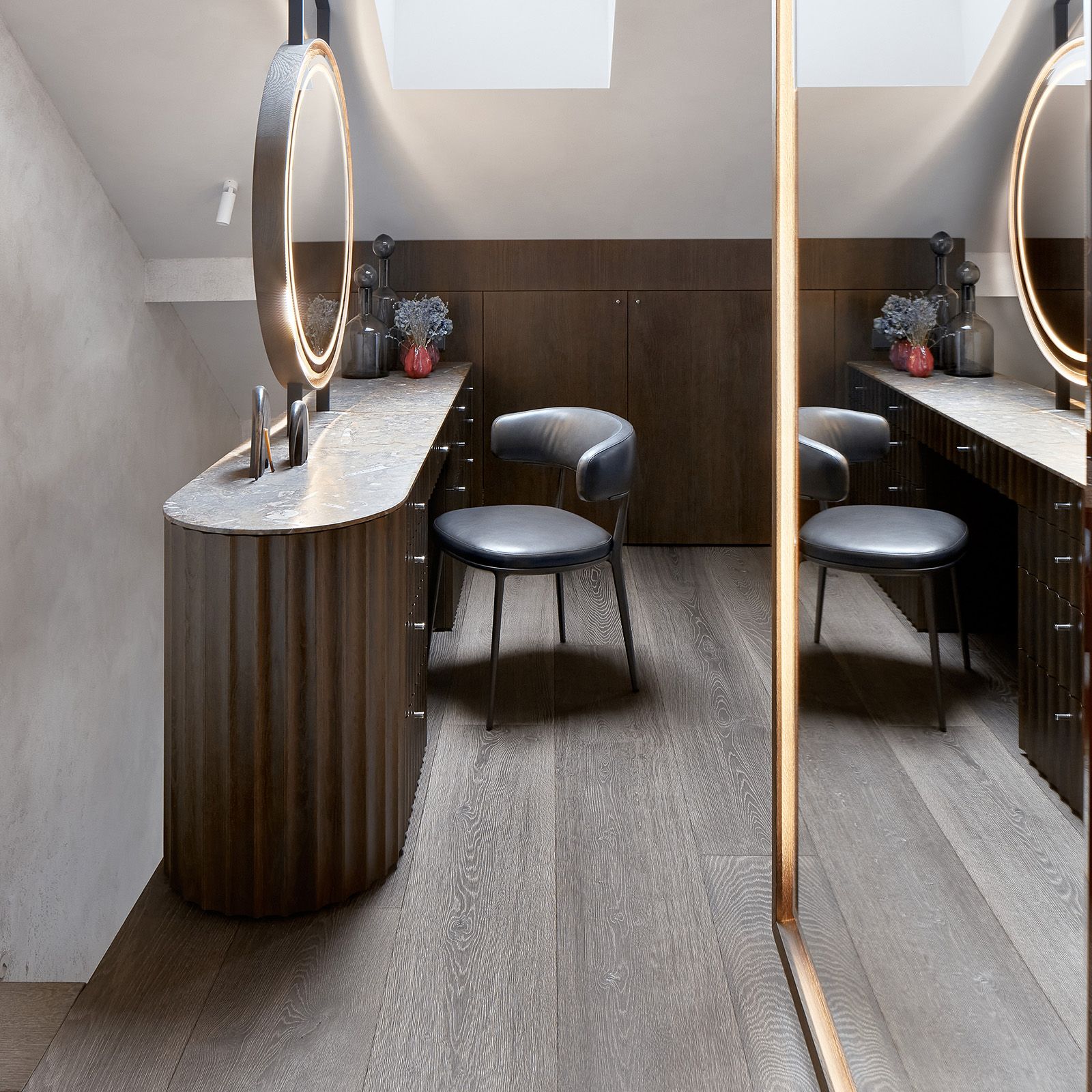 Our wide Continental Oak planks in a Select and Country mix grade, finished in Megeve Lava Hardwax, add warmth and depth throughout the space.