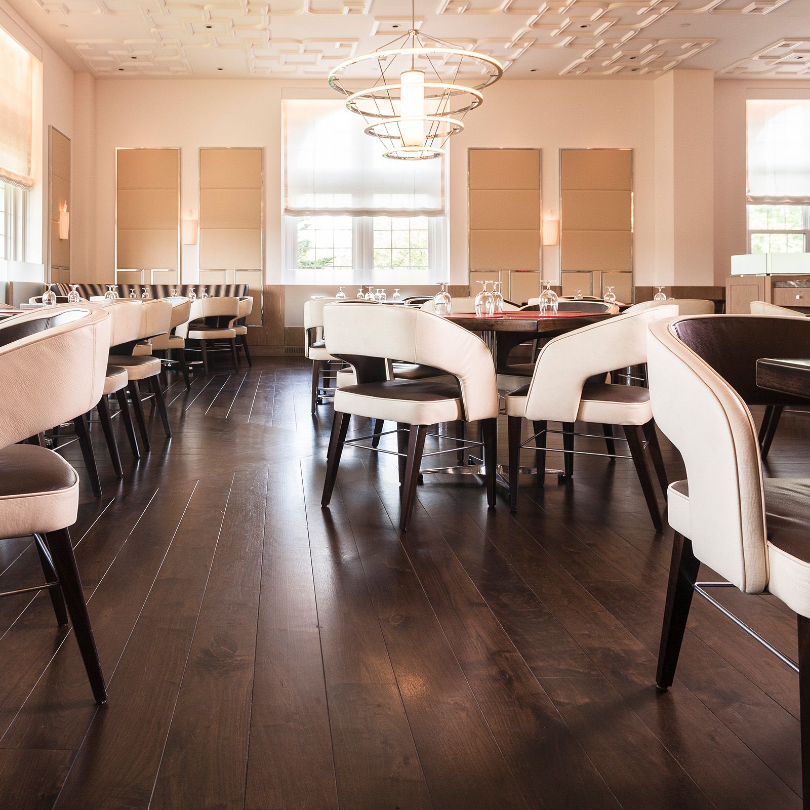 The Bocuse Restaurant at the Culinary Institute of America blends traditional elegance with modern sophistication, perfectly complemented by the rich tones of Solid American Walnut flooring.