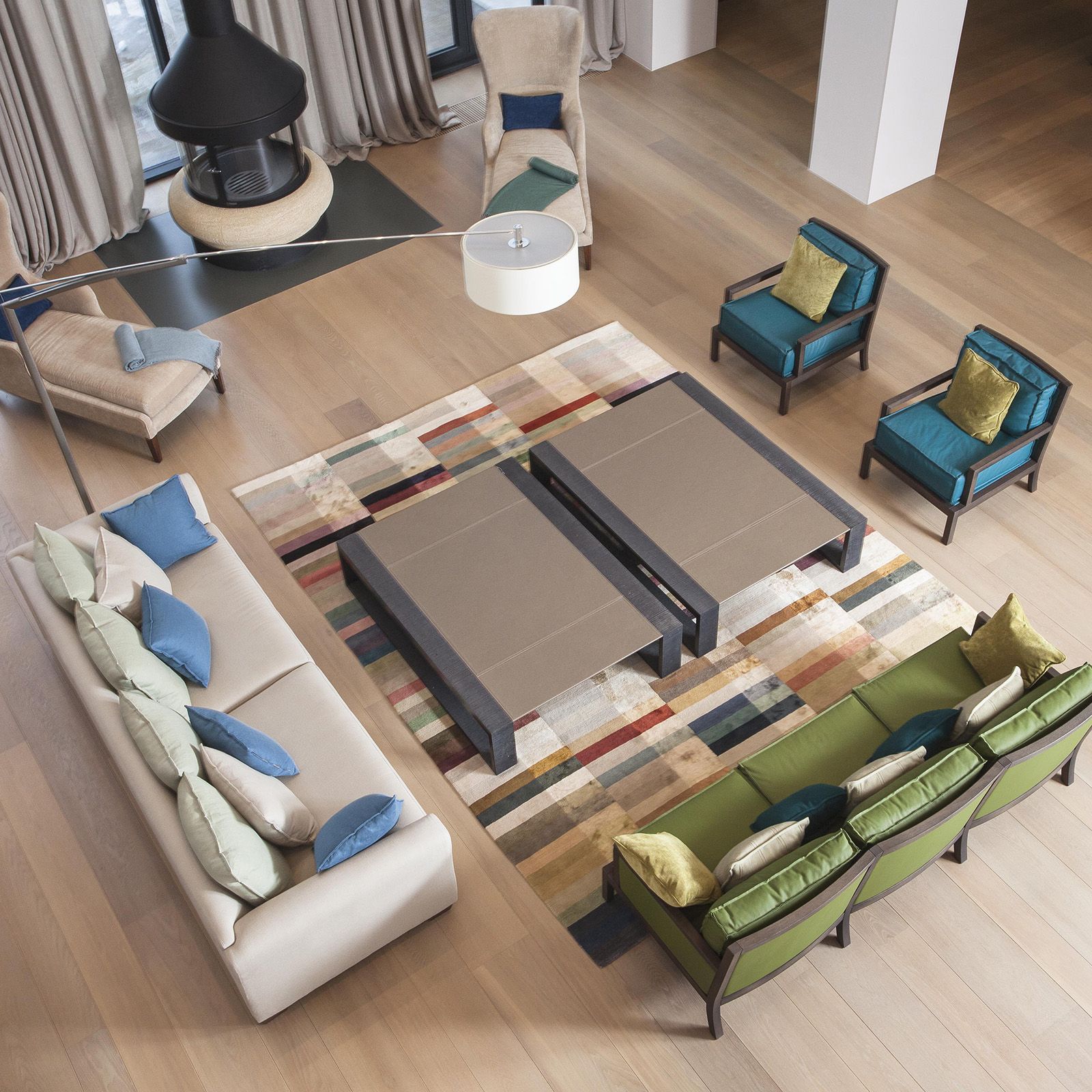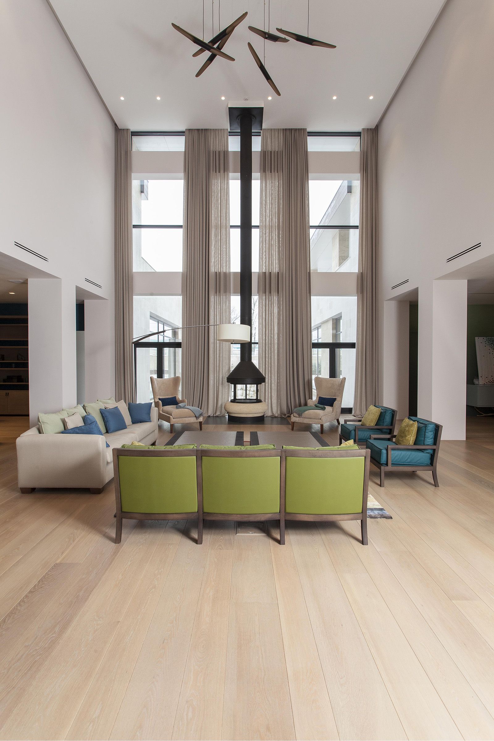 Architectural elements like curved staircases and expansive windows are beautifully complemented by the flooring, anchoring the design in a timeless aesthetic.