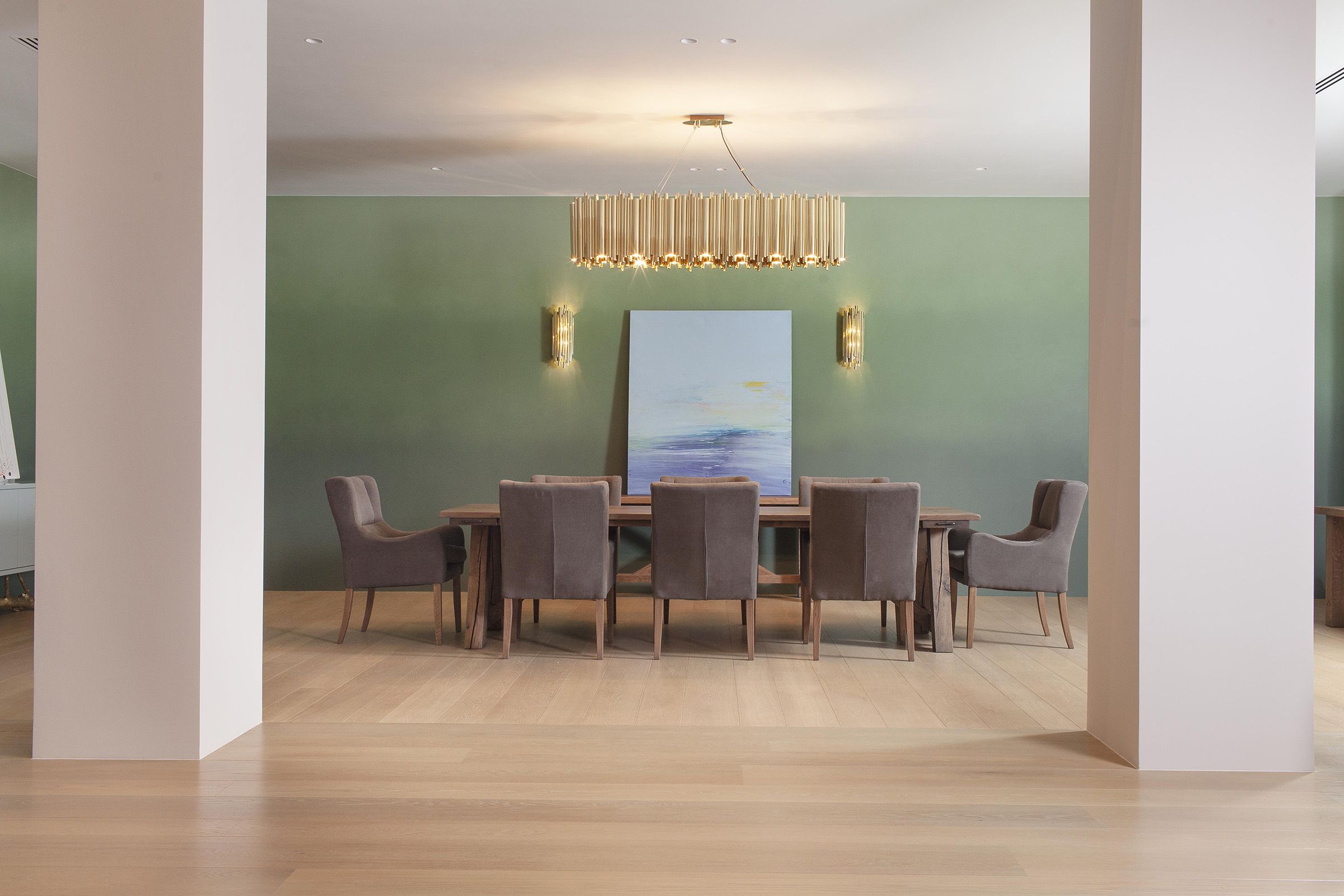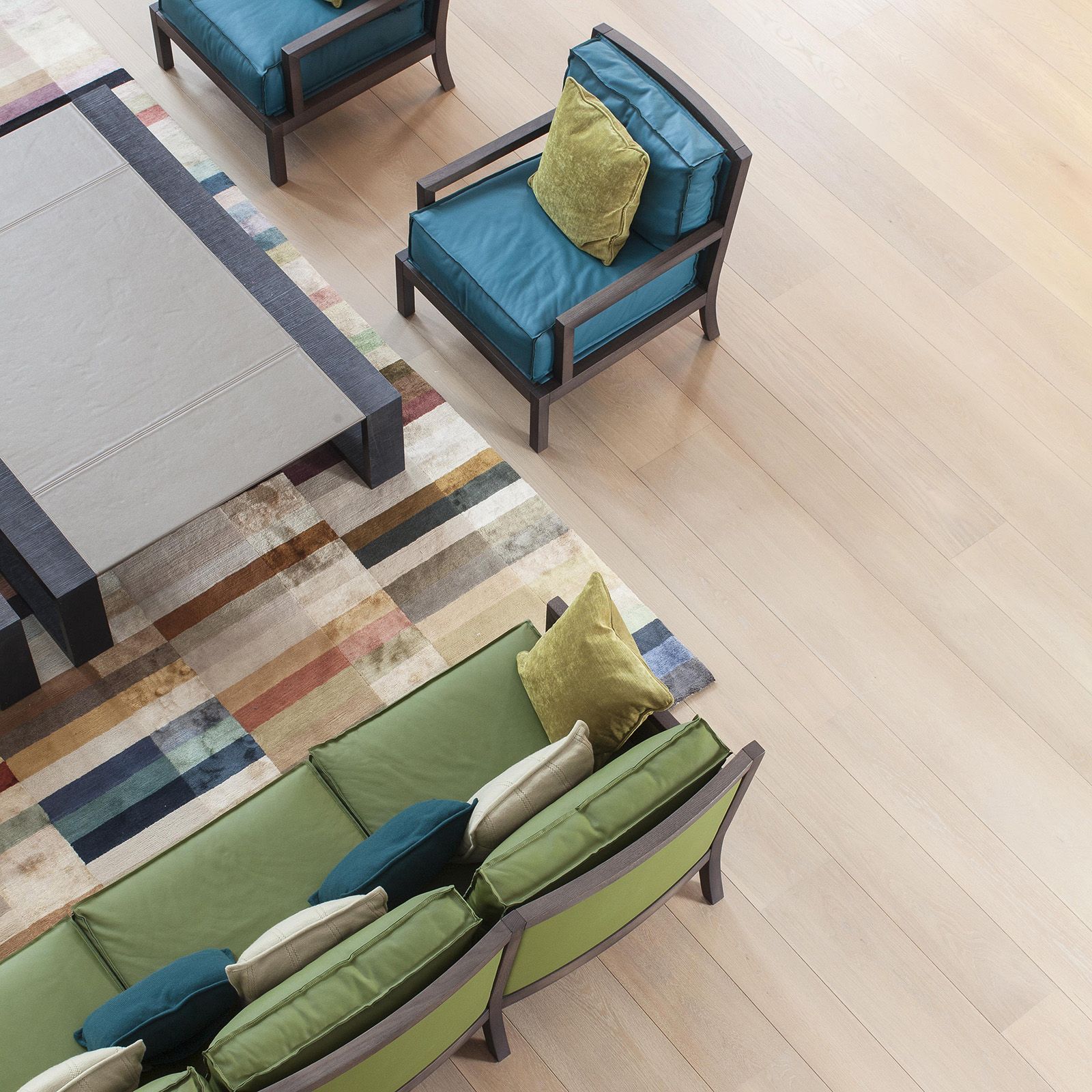 In other areas, the same Oak flooring is finished with a pure Ultramatt Poly, offering a sleek, seamless appearance that adds a modern touch. The variation in finishes adds depth and dimension, contributing to a sophisticated yet welcoming environment.