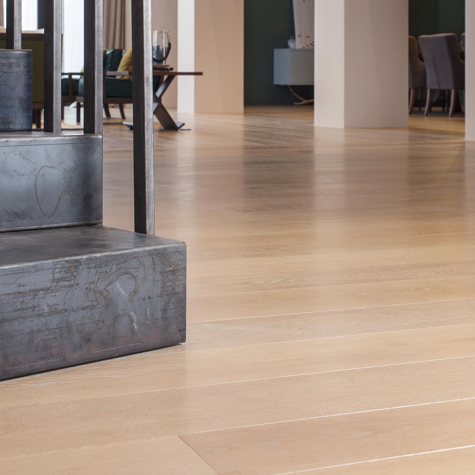 Wide planks, 17 to 35 cm in width, amplify the space's grandeur and openness. Architectural elements like curved staircases and expansive windows are beautifully complemented by the flooring, anchoring the design in a timeless aesthetic.