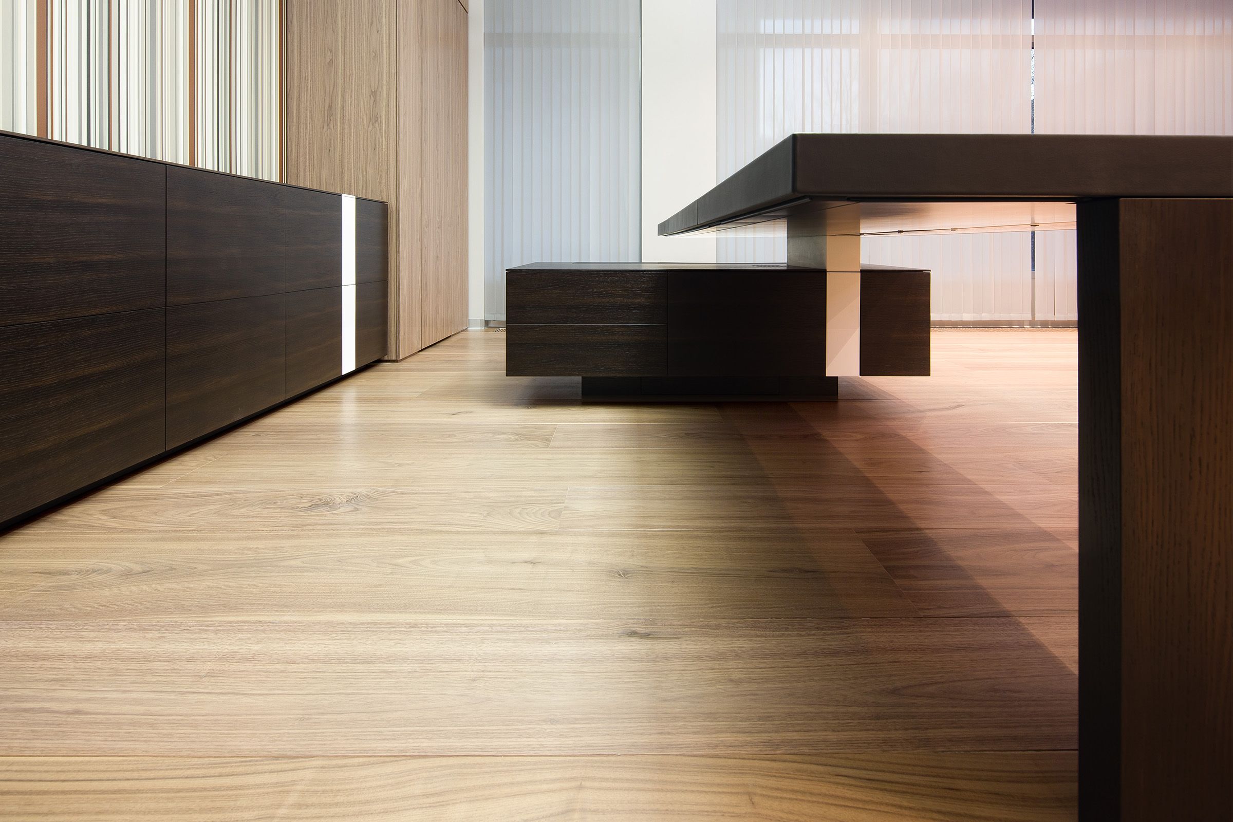The office flooring is crafted from Engineered American Walnut Fusion Select Grade, known for its rich tones and fine grain.